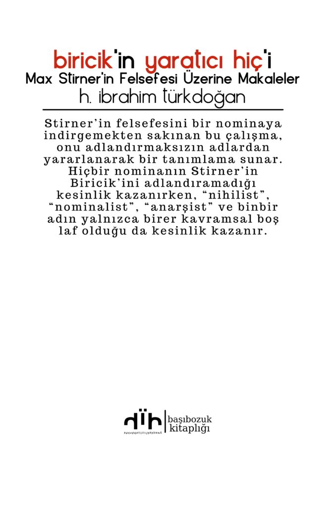 Stirner’in felsefesini bir nominaya indirgemekten sakınan bu çalışma, onu adlandırmaksızın adlardan yararlanarak bir tanımlama sunar. Hiçbir nominanın Stir-ner’in Biricik’ini adlandıramadığı kesinlik kazanırken, “nihilist”, “nominalist”, “anarşist” ve binbir adın yalnızca birer kavramsal boş laf olduğu da kesinlik kazanır.