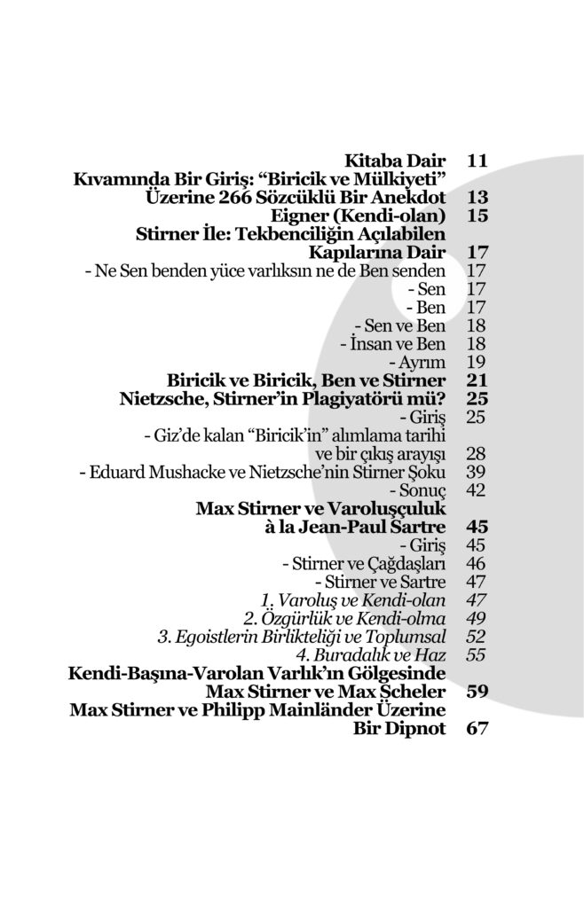 Toplam on dört makaleden oluşan bu kitabın merkezinde doğal olarak Stirner yer alıyor. Daha çok çeşitli filozof ve felsefe akımlarıyla karşılaştırılarak incelenen Stirner’in felsefesini açıklamayı, betimlemeyi, analizle-meyi ve tanımlamayı amaçlıyor bu kitap. Kapsamlı bir felsefi repertuvar içeren bu çalışma, aynı zamanda psikanalitik, pedagojik ve sosyolojik öğelere de dayanır. Metinler arasında çeşitli bağlar olsa da, her biri bir diğerinden bağımsızdır. Dolayısıyla okur, istediği metinden başlayabilir. Ama ancak kitabın tamamını okuyunca filozofun felsefesi hakkında bir sonuç elde edebilir.